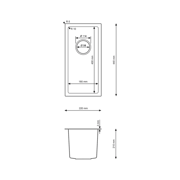 - Sink dimensions: 220 mm x 440 mm x 210 mm